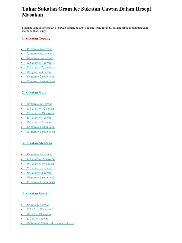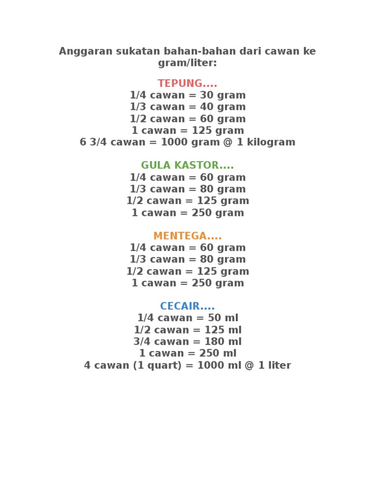 Hah ni hah sukatan kalau nk tukar cawan ke gram or vice versa. Anggaran sukatan cawan ke gram/ml. Copyright flag for inappropriate content. Kalau kat video yang sis post di youtube, sis guna ikut sukatan cawan, ada juga yang tanya nak tahu kalau guna ikut sukatan gram berapa. Doh akan jadi lembut sedikit.