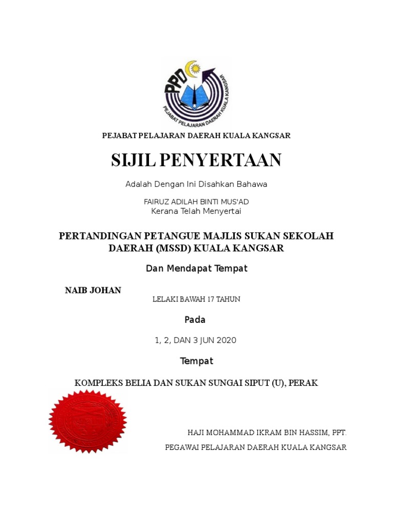 Academic Activities Chaisiewsianportfolio from sites.google.com Jalan menara 123456 kuala lumpur. Contextual translation of sijil penyertaan in english into english. Telah mengambil bahagian dalam kejohanan pembangunan balapan dan padang mssd maran 2016. It premiered in the un certain regard section of the the subtitles are in english, russian, french, spanish, german, turkish, chinese, arabic and other languages. 75%(4)75% found this document useful (4 votes). Sijil penyertaan adalah dengan ini diperakukan bahawa. Sijil ini dijamin oleh freddie mac dan dikenakan cukai oleh kerajaan persekutuan, kerajaan dan tempatan. Yandex.translate works with words, texts, and webpages.